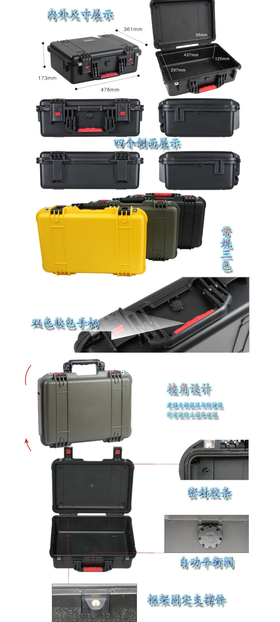 簡(jiǎn)要說明:廣泛用于傳媒、公安、消防、軍隊(duì)、航空、戶外攝影、野外考察、科學(xué)探測(cè)等眾多領(lǐng)域的高端儀器、儀表。具有高強(qiáng)度、高抗壓沖擊、防潮、絕對(duì)密封、防塵、防水等特點(diǎn)。產(chǎn)品材質(zhì):ABS原料,箱體采用高抗沖擊的高分子聚合材料一體注塑成型,密封采用扁型彈性發(fā)泡密封橡膠條,確保防水氣密,所有較軸均采用不銹鋼材質(zhì)。